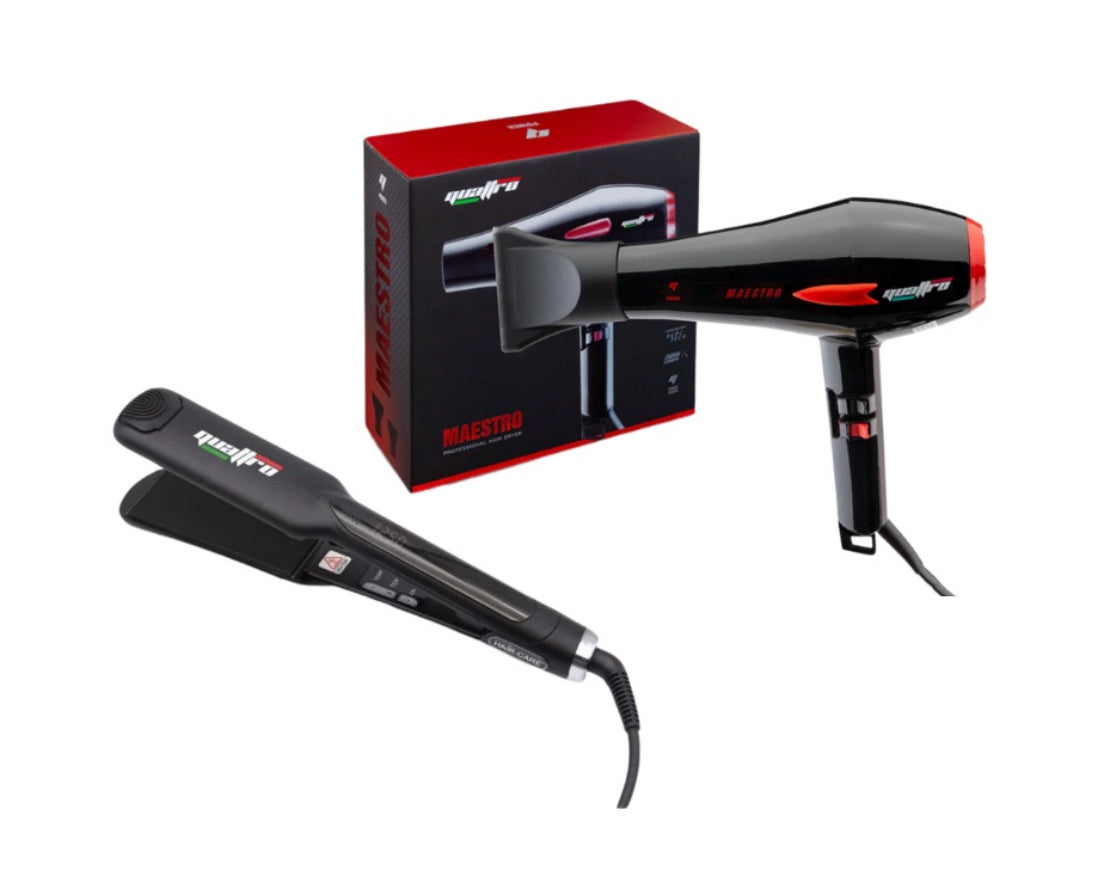 המארז המושלם מבית מותג הטיפוח המקצועי קוואטרו. המארז מכיל: מחליק שיער מקצועי פלטות טיטניום רחבות פן מאסטרו פחם... -
