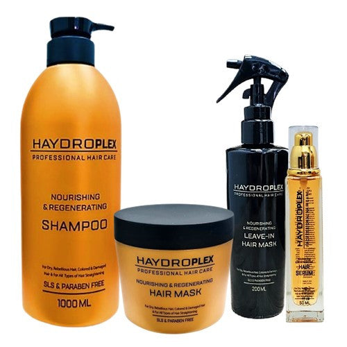 מארז היידרופלקס זהב ללא מלחים לשיקום השיער הכולל שמפו 1000 מ״ל + מסכה 500 מ״ל + סרום 50 מ״ל + מסכה ללא שטיפה 200 מ״ל