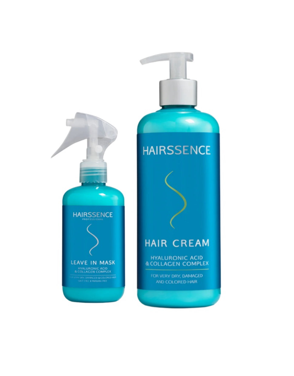 מארז היירסנס לטיפוח ועיצוב השיער מתאים לכל סוגי השיער. המוצרים אינם מכילים מלחים או פרבנים ומתאימים גם לשיער מוחלק צבוע או פגום. סדרת המוצרים של היירסנס מבוססים על פורמלות מרוכזות המכילות חומצה הילוראנית קרטין וקולגן בריכוז גבוה לחיזוק השיער, הזנה בלחות, ושמירה מפני נזקי האקלים והחום.
