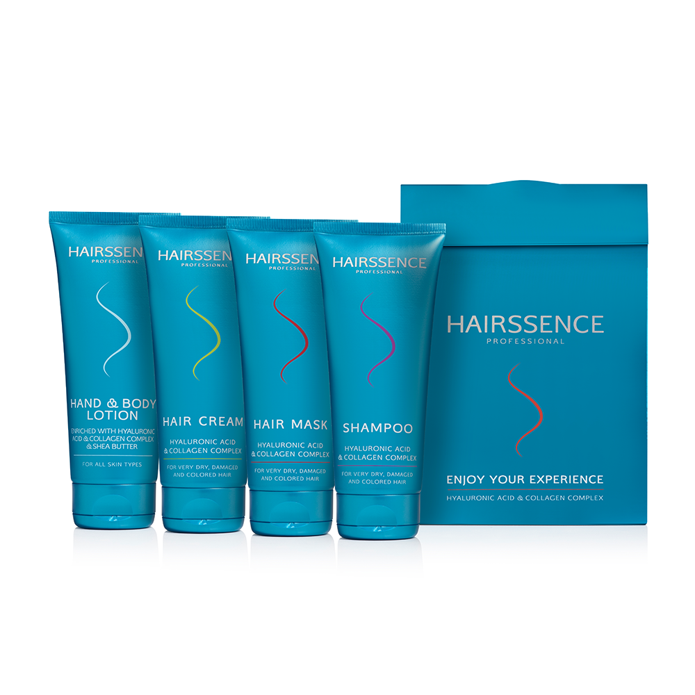 ארבעה מוצרי טיפוח מבית הייר סנס המבוססים על חומצה הילוראנית, קרטין טהור וקולגן. להזנה, שיקום ולחות מירבית לשיער ולגוף. מכיל שמפו לשיער, מסכת שיער, קרם לחות לשיער, קרם גוף וידיים.